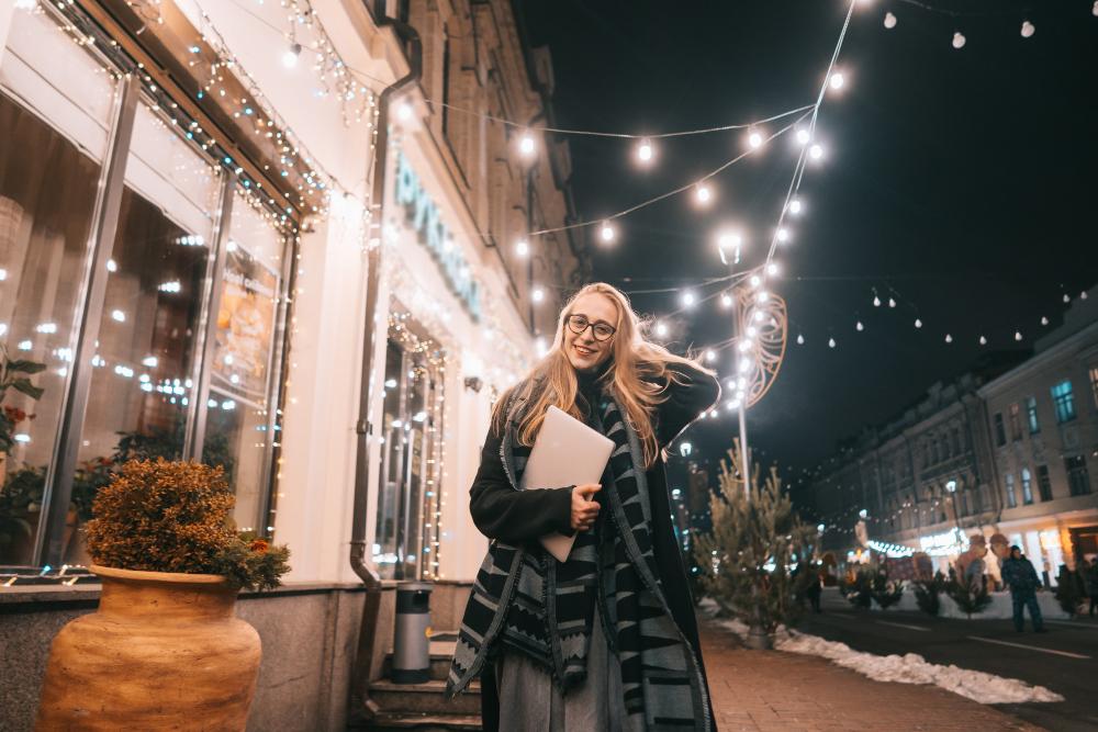 במרכז הכיכר מוצב עץ חג מולד ענק, ותאורה קסומה צובעת את כל האזור באור חם.